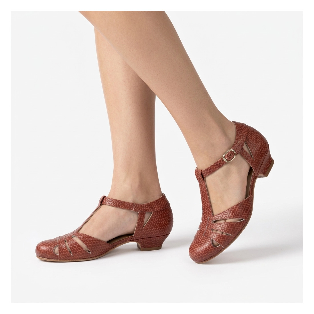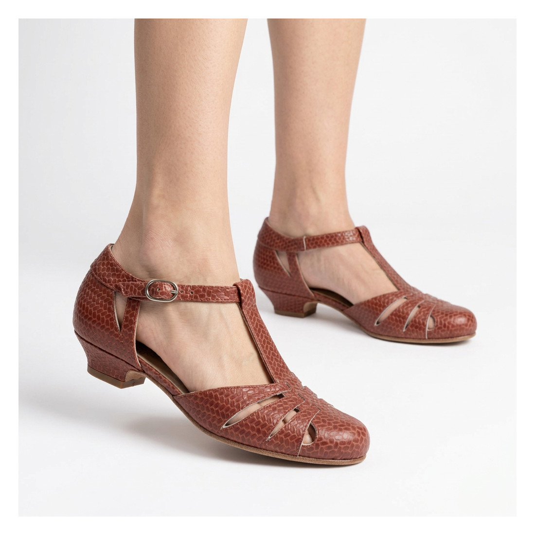 Aus geflochtenem Kirschleder gefertigt, vereinen diese Schuhe vintage Eleganz und modernen Komfort. Die verflochtene Struktur verleiht ihnen Tiefe und Charakter, während der 2 cm Absatz und die Ledersohle bei jedem Schritt Bewegungsfreiheit garantieren – auf und abseits der Tanzfläche.