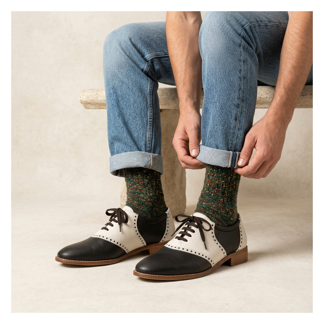 Elegancia clásica con contraste. Los Saddle Shoes Dark Chocolate & Cream para hombre reinterpretan un diseño histórico del siglo XX combinando tonos profundos y cremosos que realzan su carácter sofisticado.